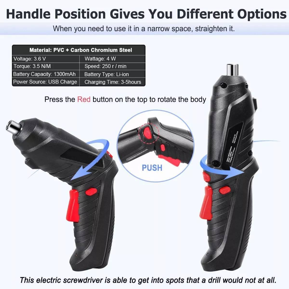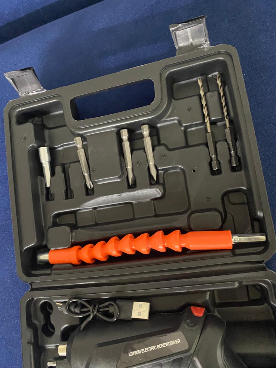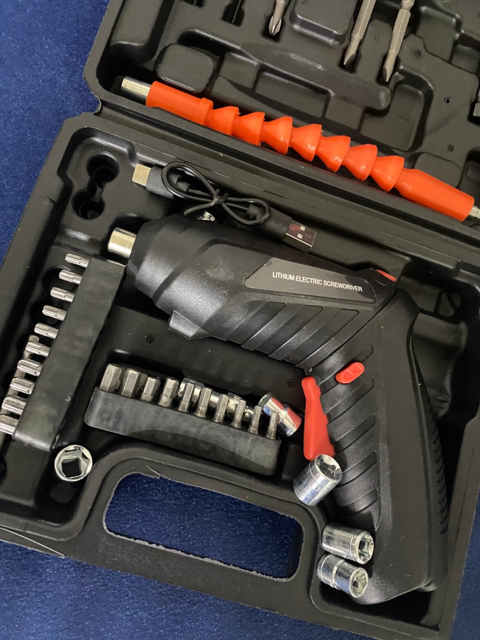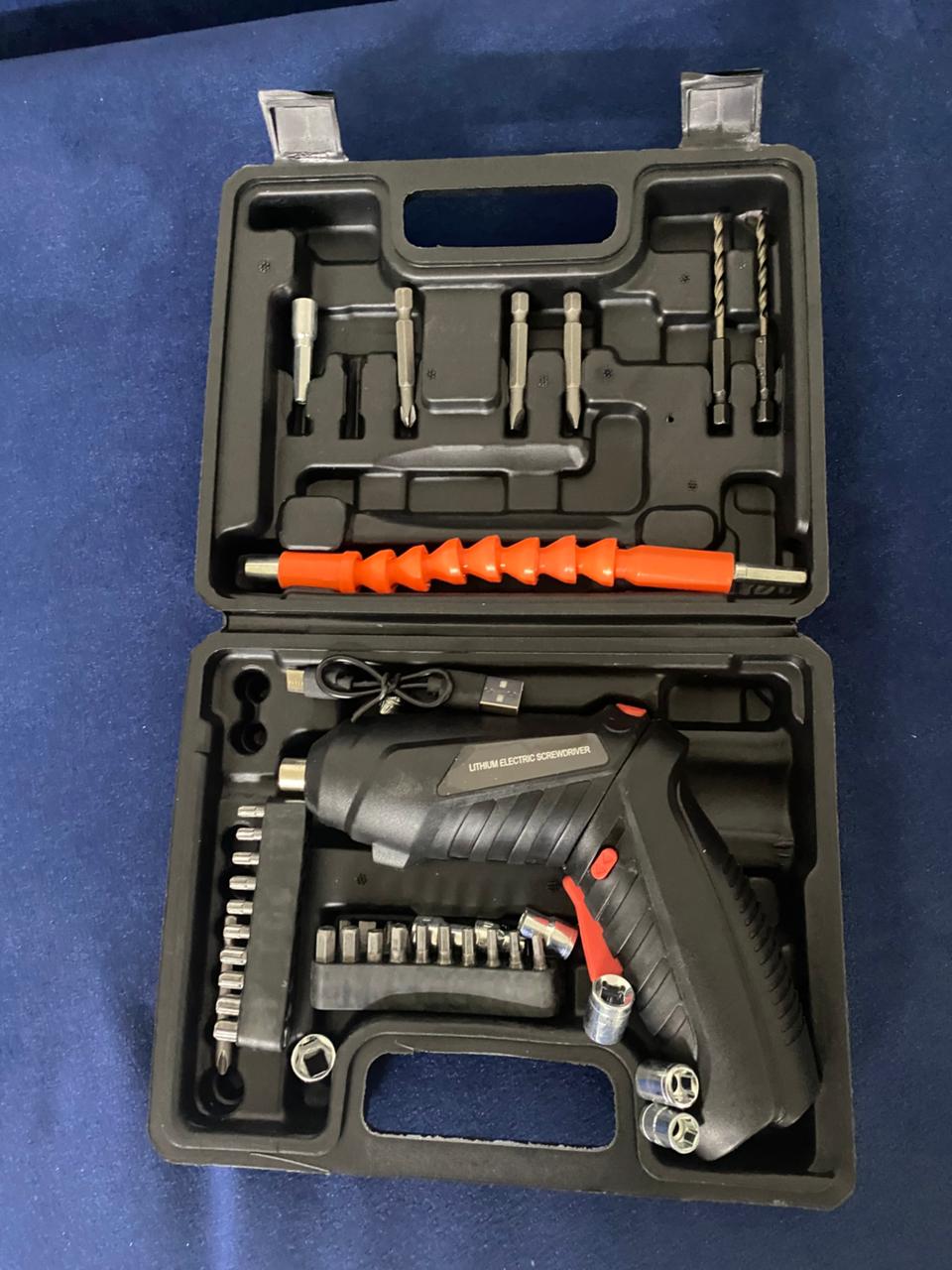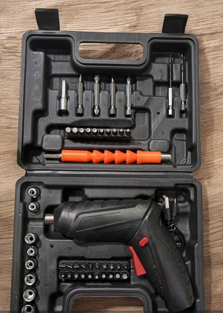Este kit incluye un destornillador eléctrico compacto y práctico, ideal para trabajos de ensamblaje, reparación y mantenimiento en el hogar o negocio. Su diseño ergonómico facilita el uso con una sola mano, permitiendo mayor comodidad y precisión.